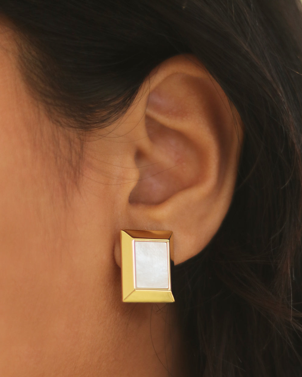 The Blanca Gold Studs combine a classic rectangular gold frame with a center of luminous mother-of-pearl, a material often used in traditional Filipino architecture. These studs offer a blend of modern sophistication and cultural inspiration. - +�� shipping