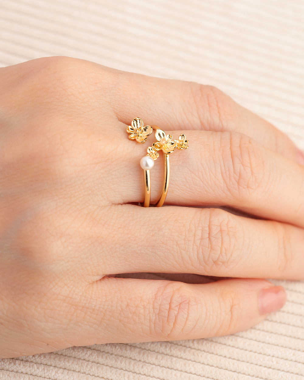 The�Cathy Gold Ring features a delicate orchid-inspired design. A single, shell pearl accents the floral motif, adding a touch of natural elegance. This ring offers a subtle yet sophisticated way to embrace botanical beauty.