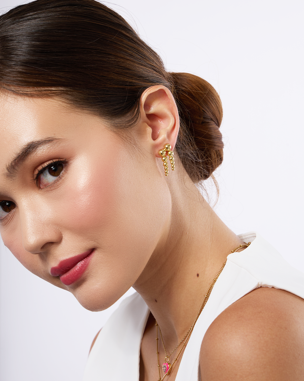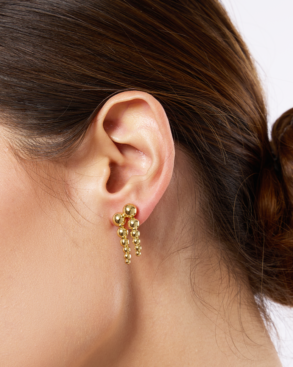 Add dimension to your looks with the Renee Gold Studs, a playful and feminine pair of statement stud earrings. The cluster of small spheres adds a touch of fun to any outfit.